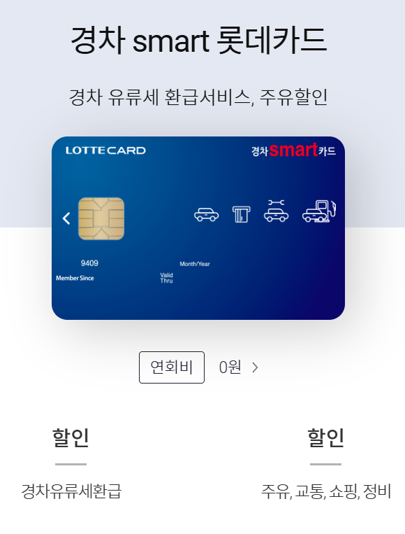 | 롯데카드 [경차 smart 롯데카드] | 영화 할인, 외식 할인 등 다양한 부가 서비스 포함 |