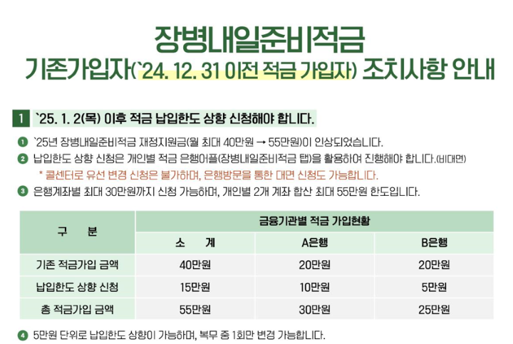 2024년 12월 31일 이전에 적금에 가입하신 분들도 납입한도를 상향신청하실 수 있으니 지금 바로 신청하시길 바랍니다.