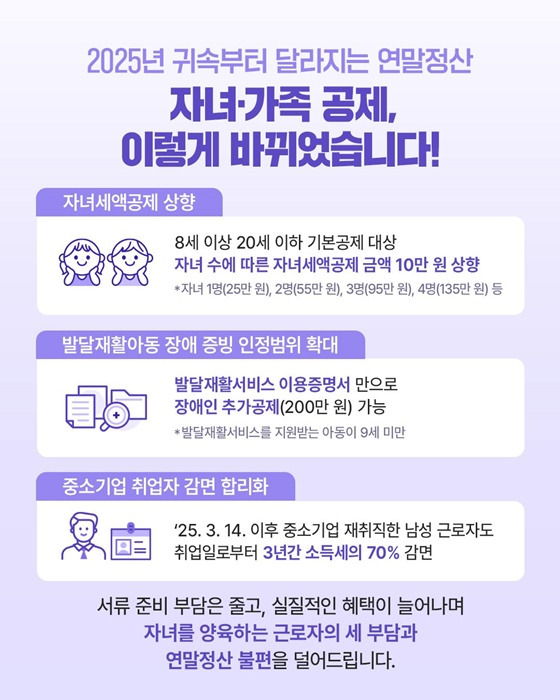 국세청은 자녀 양육, 주거 안정, 생활체육, 기부 활성화 등 실제 근로자의 삶과 밀접한 영역을 중심으로 공제와 감면 제도를 대폭 개선했습니다.