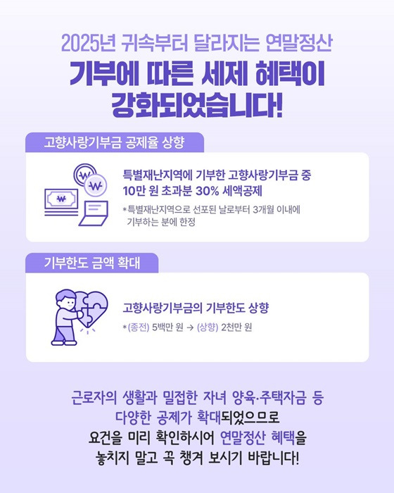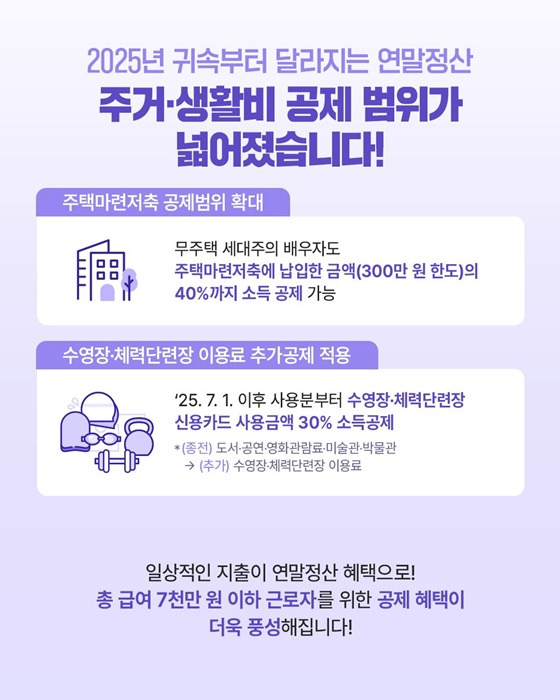 2025년 귀속 연말정산은 ✔ 자녀가 있는 가정 ✔ 무주택 근로자 ✔ 생활체육 이용자 ✔ 기부 참여자에게 실질적인 세금 환급 효과가 크게 늘어난 해입니다.